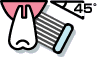 歯と歯肉の境目に向けて、歯ブラシを45°に当てて、軽く振動させる。この時、歯ブラシは細かく振動させる。